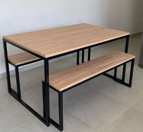 Mesa Industrial com bancos, ideal para refeitórios, áreas gourmet ou restaurantes. Produzida em aço carbono, metalon 30x50x1.20mm. Pintura eletrostática epóxi. Ponteiras em polipropileno com regulagem. Tampo em MDF 18mm, cores a escolha do cliente. Feita sob medida, podendo chegar até 10 lugares por mesa.